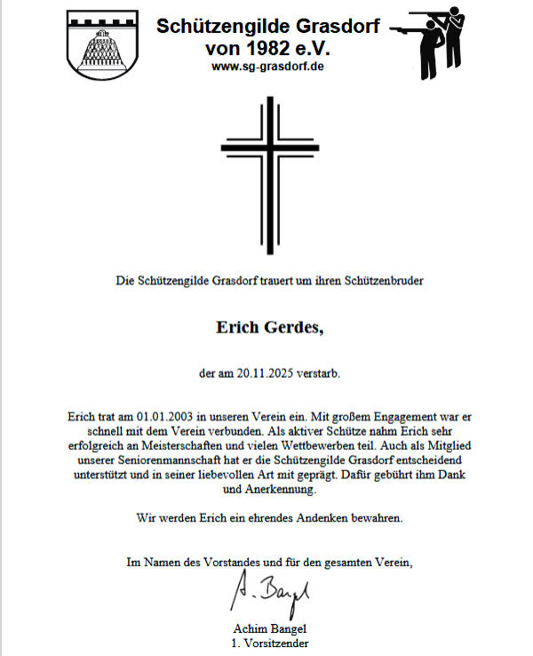 Erich trat am 01.01.2003 in unseren Verein ein. Mit großem Engagement war er schnell mit dem Verein verbunden. Als aktiver Schütze nahm Erich sehr erfolgreich an Meisterschaften und vielen Wettbewerben teil. Auch als Mitglied unserer Seniorenmannschaft hat er die Schützengilde Grasdorf entscheidend unterstützt und in seiner liebevollen Art mit geprägt. Dafür gebührt ihm Dank und Anerkennung.